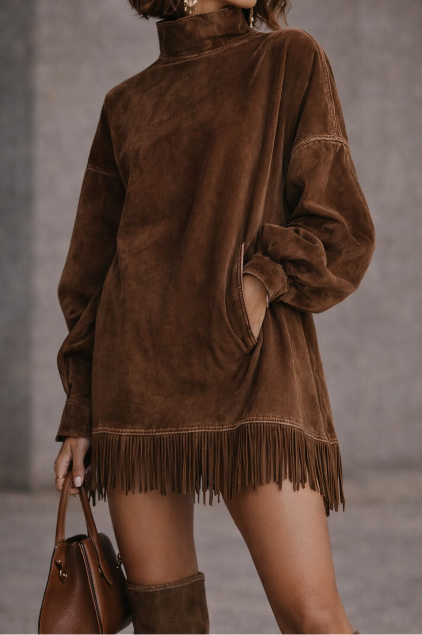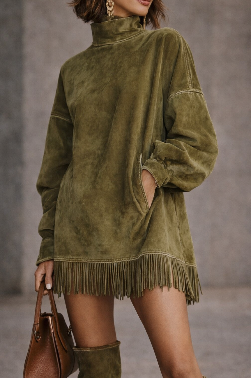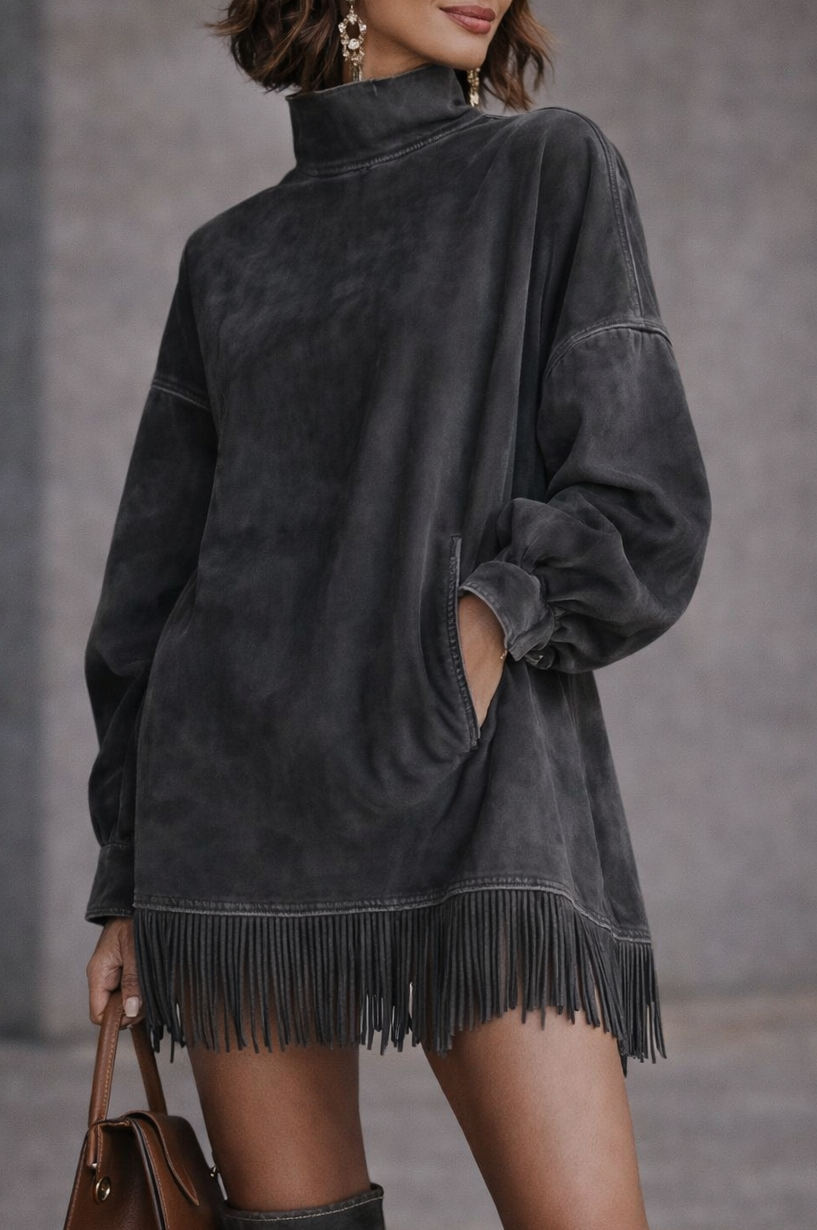 This relaxed tunic dress is designed for women who want to look put-together without sacrificing comfort. The flowing silhouette drapes naturally over the body, while the distinctive neckline and playful fringe hem add character and movement. Easy to wear, easy to style, and perfect for days when you want impact without effort.